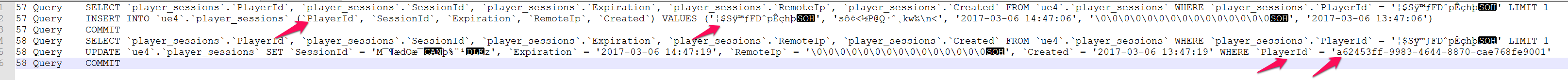 The INSERT statement is working perfectly, but the UPDATE statement isn't. I expect the UPDATE statement to have the PlayerId set to the binary value of 'A62453FF998346448870CAE768FE9001' (because of my model's beforeSave() event).