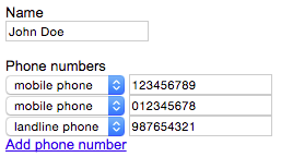 In the following form, phone type and phone number can appear an infinite number of times (the "Add" link is handled by Javascript):