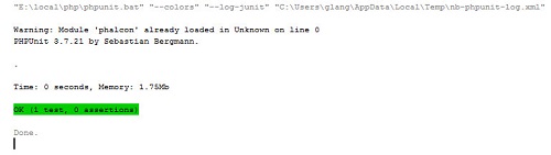i use Netbeans 8.0,2 on windows7 for my php and i use PHPUnit for testing. when run testing, the window waring appear with content: Module 'phalcon' already loaded. How to disable it ? Thanks.